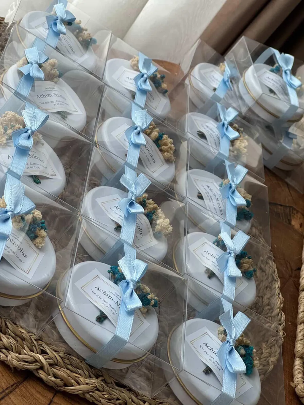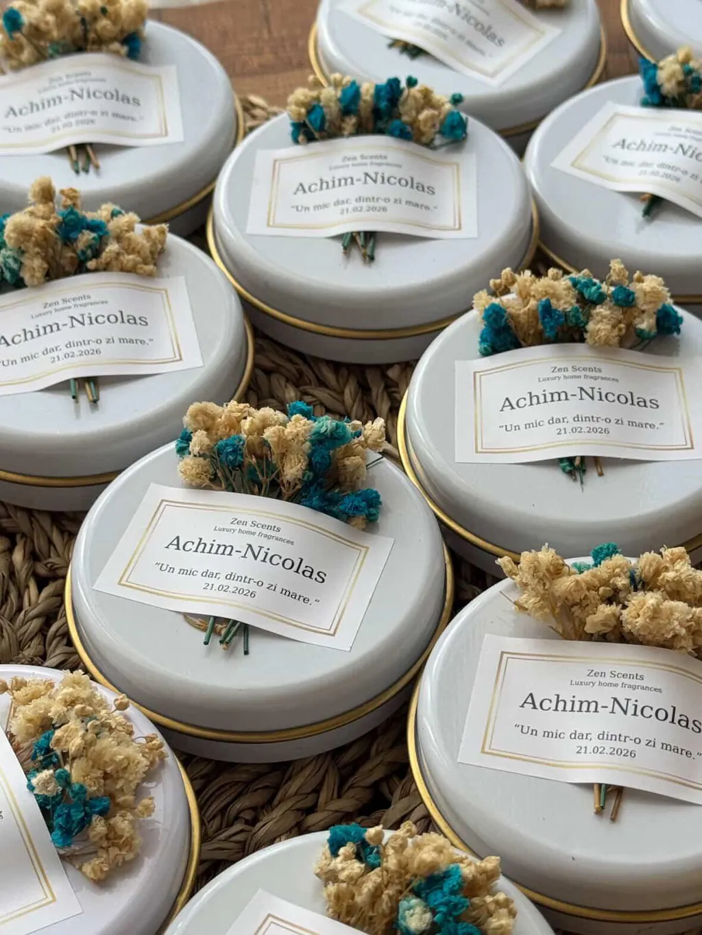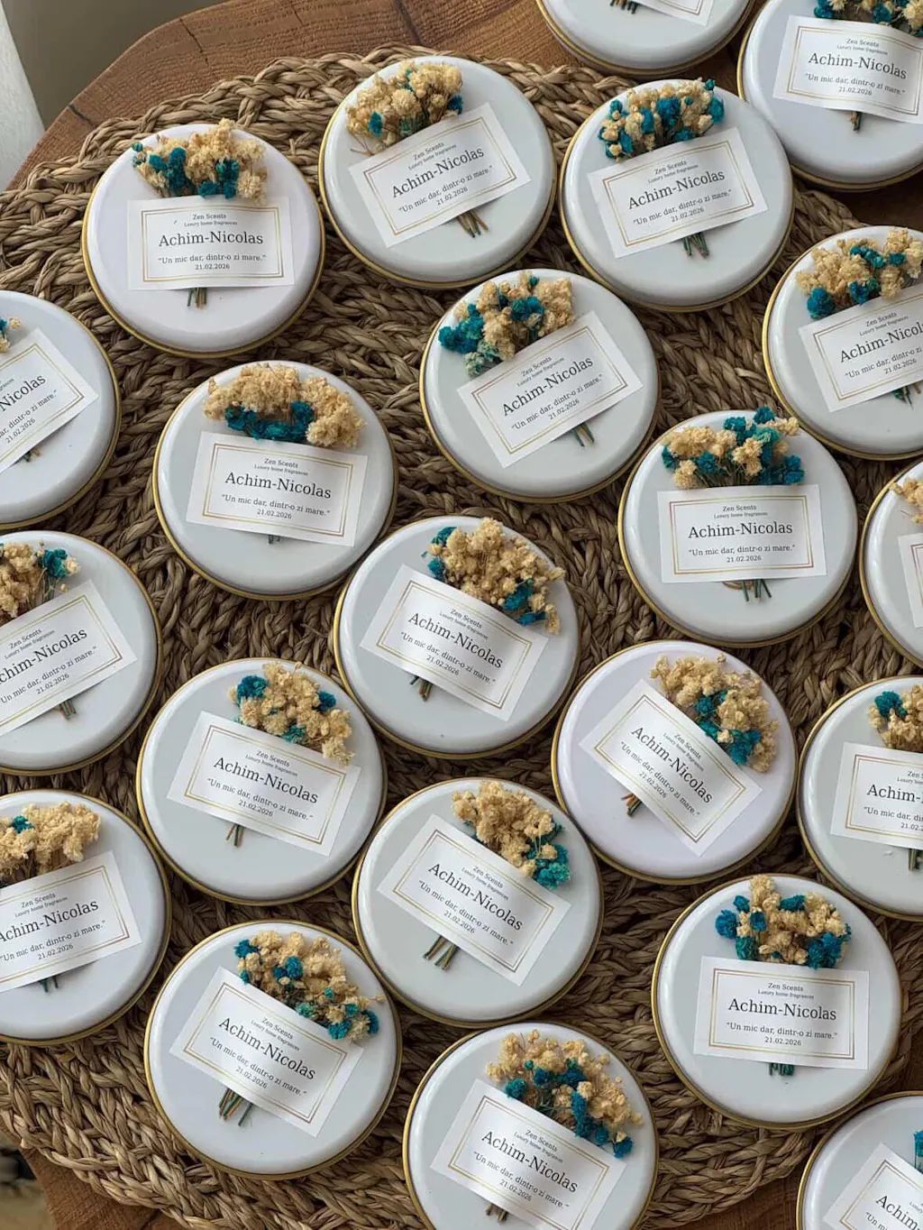Fiecare piesă este realizată din ceară de soia, cu parfumuri atent alese, și este personalizată cu etichetă și ambalare elegantă, gata de oferit invitaților la botez sau nuntă.