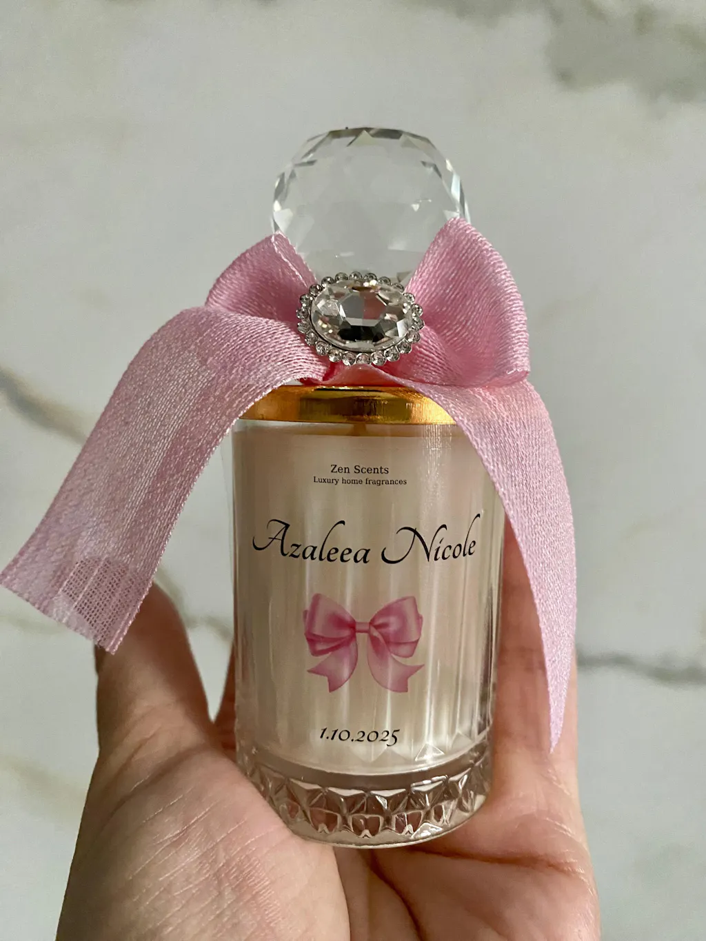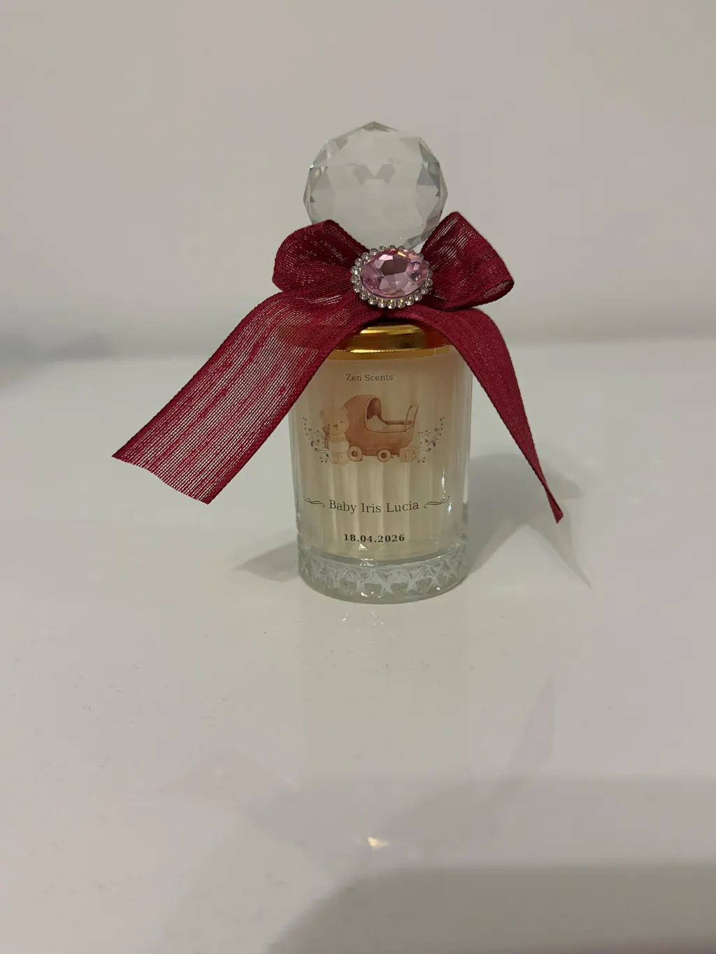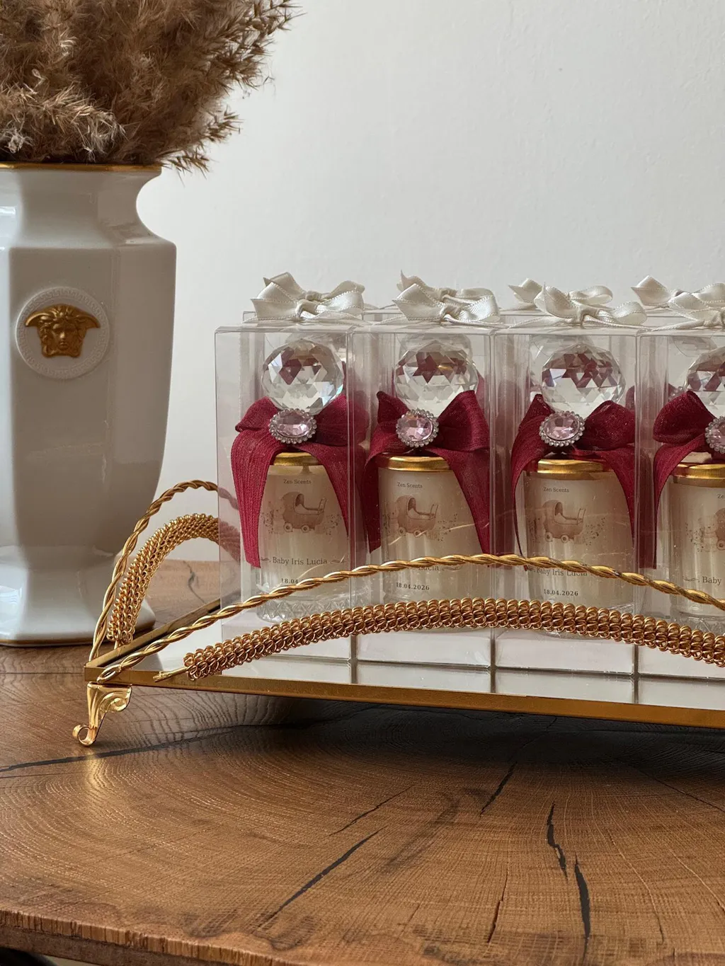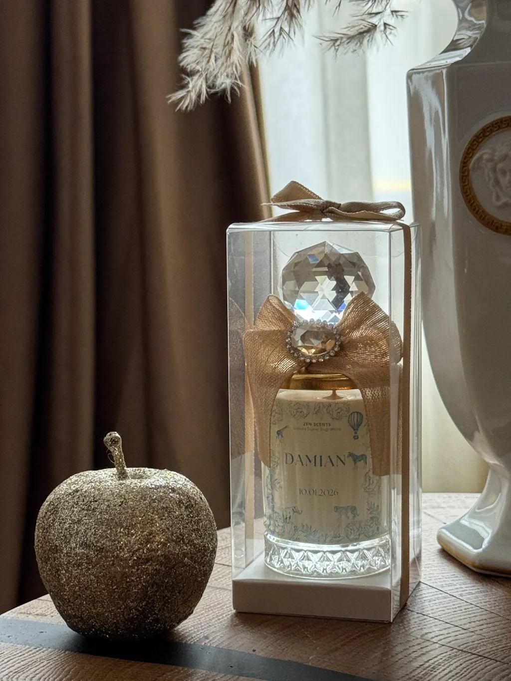 Creată pentru evenimente speciale, această lumânare îmbină parfumul delicat cu un detaliu decorativ prețios, oferind invitaților o amintire luminoasă, cu aer exclusivist.
