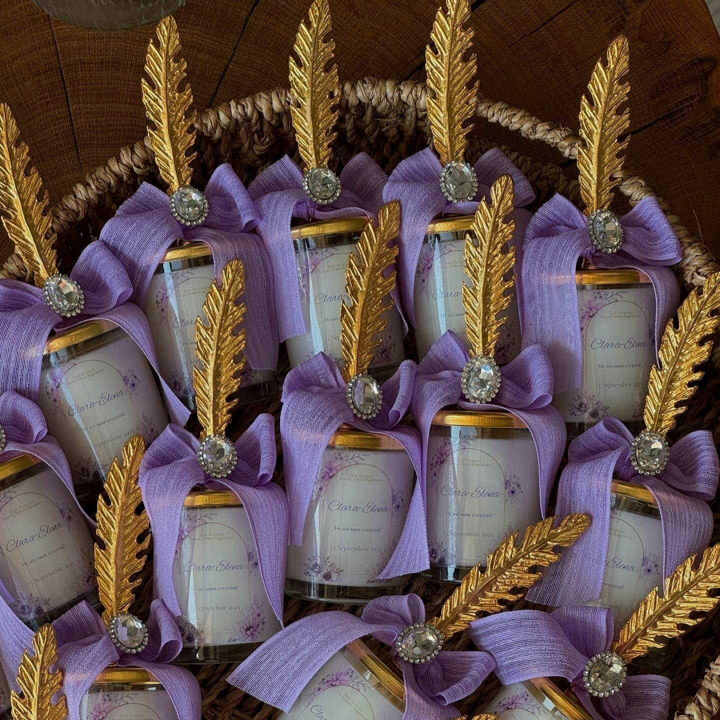 Lumânarea este realizată din ceară de soia, cu parfumuri atent selecționate, și este personalizată cu etichetă și ambalare elegantă, gata de oferit invitaților la botez sau nuntă.
